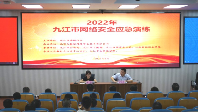2022年8月30日,由九江市委网信办牵头主办的2022年九江市网络安全应急演练活动在我校综合楼7楼报告厅举行。本次演练活动由九江市公安局、九江市卫健委、九江市国家安全局、江西财经职业学院、中国人民银行九江市中心支行、九江市妇幼保健院等单位参与。会上,市委网信办介绍了网络安全面临的严峻形势和应急演练活动的重要意义及议程,进行了网站遭篡改、个人电脑恶意软件下载大面积中毒感染事件、某医院信息泄露事件等科目演练。会议要求相关单位结合我市网络安全宣传周活动开展,注重网络安全保密工作,做好相关措施防范。